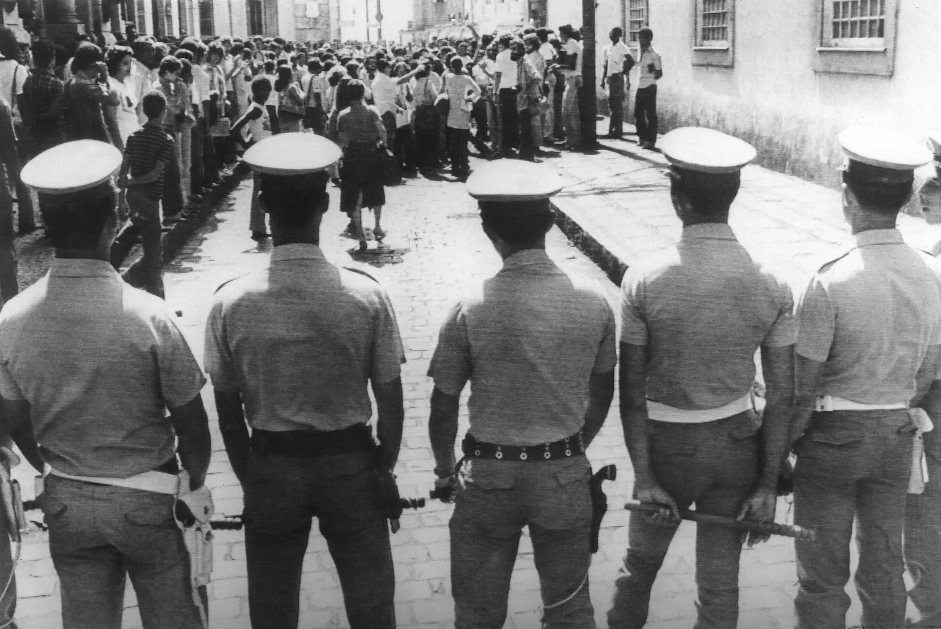 Manifestação pela Anistia cercada pela polícia em Salvador (BA), em 21 de agosto de 1979, uma semana antes da sanção da lei. A cena ilustra a tensão entre o projeto de anistia parcial do governo Figueiredo e a demanda popular por um perdão “amplo, geral e irrestrito”.