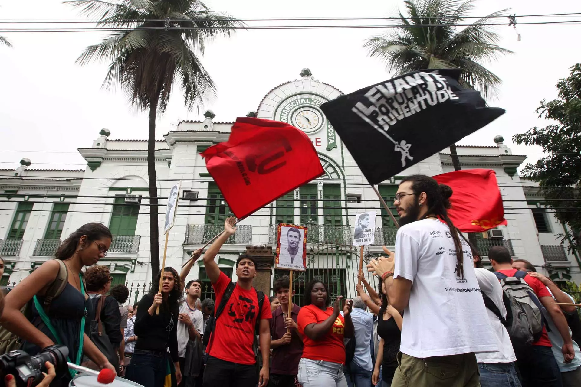Manifestantes protestam em frente ao antigo DOI-CODI do Rio de Janeiro, em 23 de setembro de 2013, durante uma visita oficial da Comissão da Verdade e de parlamentares ao local. O ato pedia justiça e a apuração dos crimes de tortura e assassinato cometidos no local durante a Ditadura Militar.