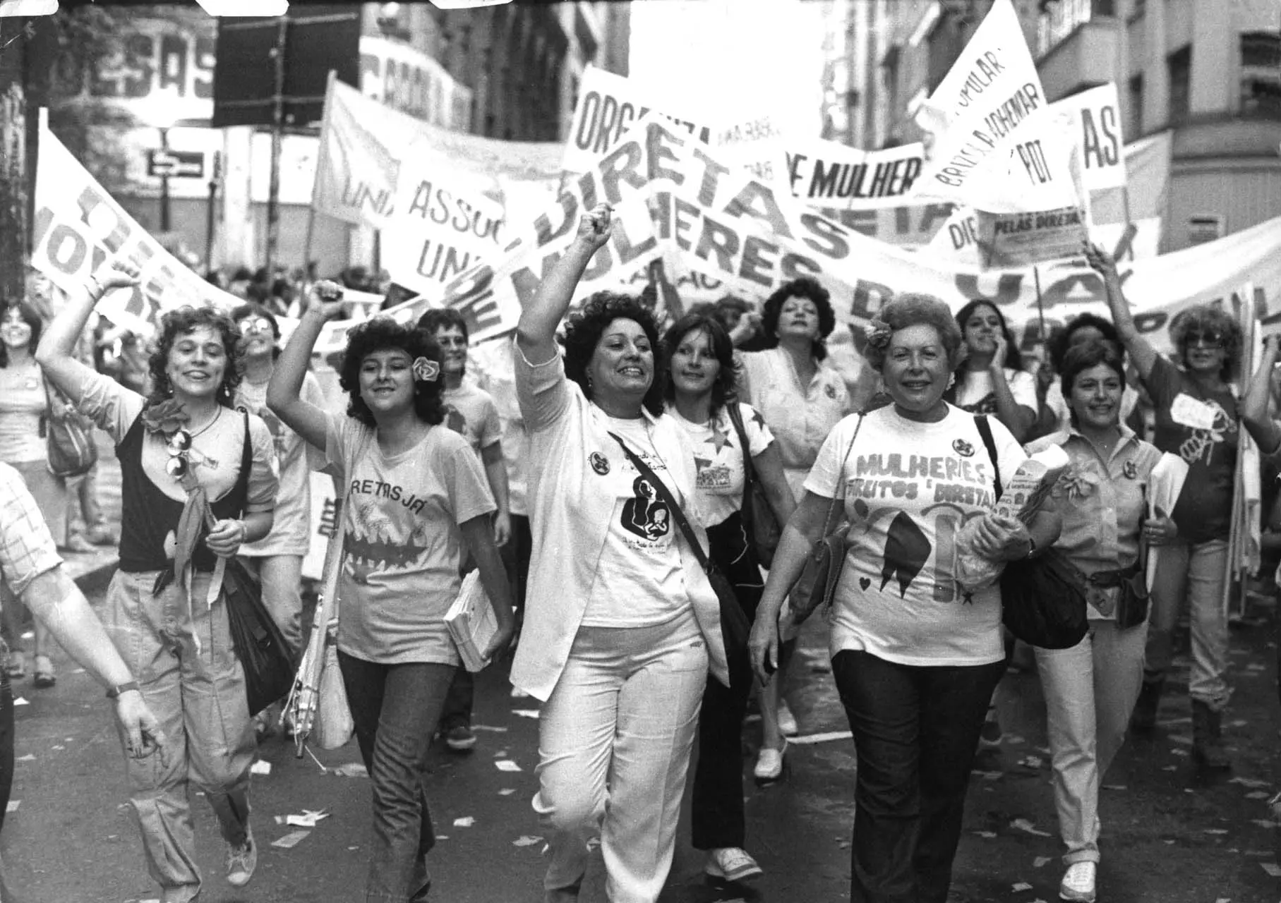 Mulheres participam ativamente do comício das “Diretas Já” em São Paulo, no dia 16 de abril de 1984. A imagem de Claudine Petroli destaca o protagonismo feminino no maior movimento popular da história do Brasil, unindo a luta pela redemocratização às pautas do movimento de mulheres.